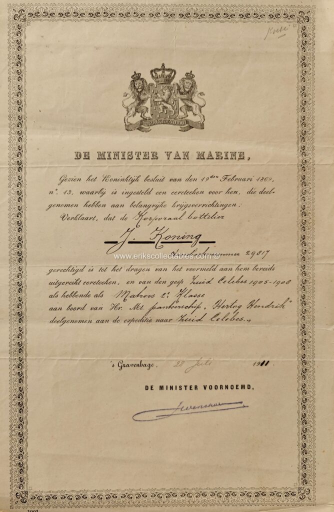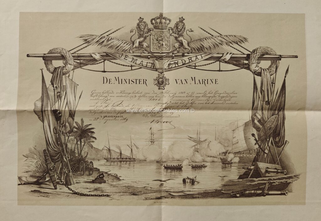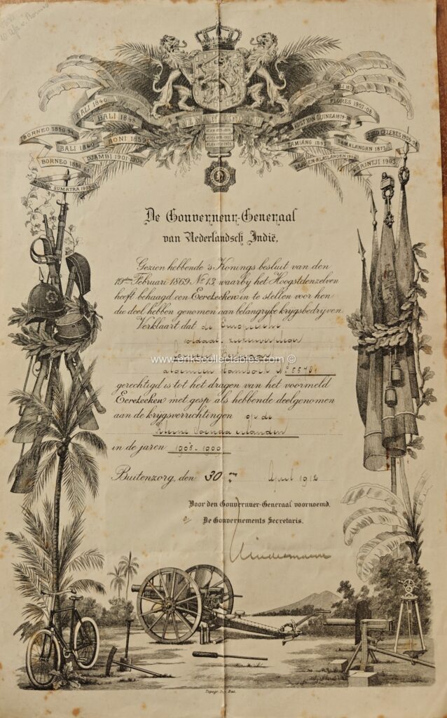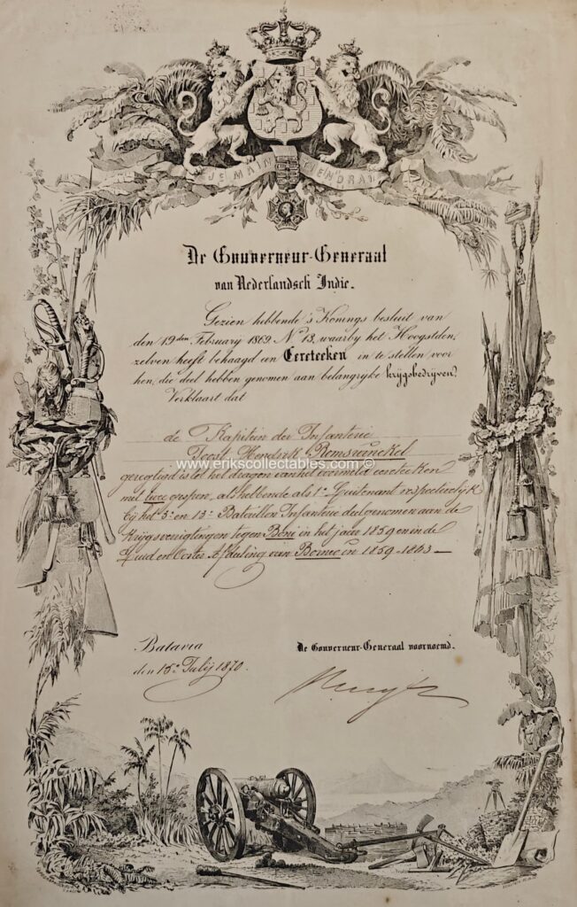 De bovenstaande oorkonde is aan Joost Hendrik Romswinckel, uiteindelijk Luitenant Generaal (titulair) en Ridder Militaire Willemsorde 3e klasse! Zijn MWO4 werd hem verleend voor zijn betoonde moed in de Bonische Expeditie waarvoor bovenstaande oorkonde ook bedoeld is. Opmerkelijk is ook dat de oorkonde twee gespen omvat die beide retrospectief waren.
