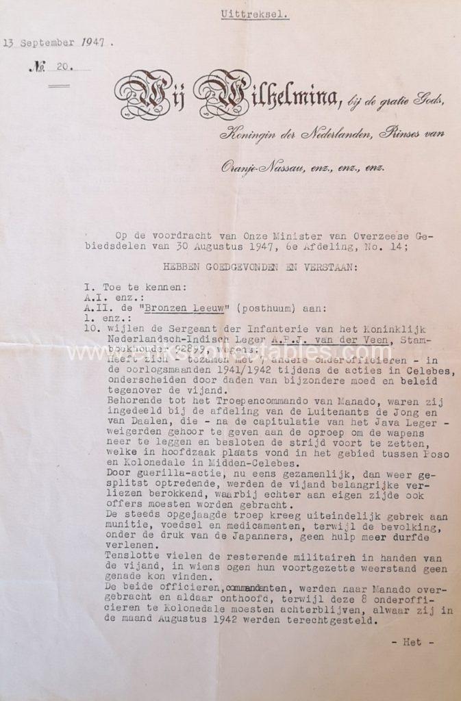 Citation. See for the full text in Dutch farther below. It states that the awardee sergeant A.P.J. van der Veen was awarded the BL for his guerilla actions on the island of Celebes after the Japanese invasion (and following Dutch surrender) together with 7 other NCO’s and 2 officers. They participated in actions as a group but also split into several smaller groups led by the two officers. After some time they had no ammunition and food supplies left and fell into the hands of the Japanese. The Japanese showed no mercy for the continuation of guerilla actions after the main force had already surrendered. All 10 men were executed in August 1942 by the Japanese but on different dates and locations.