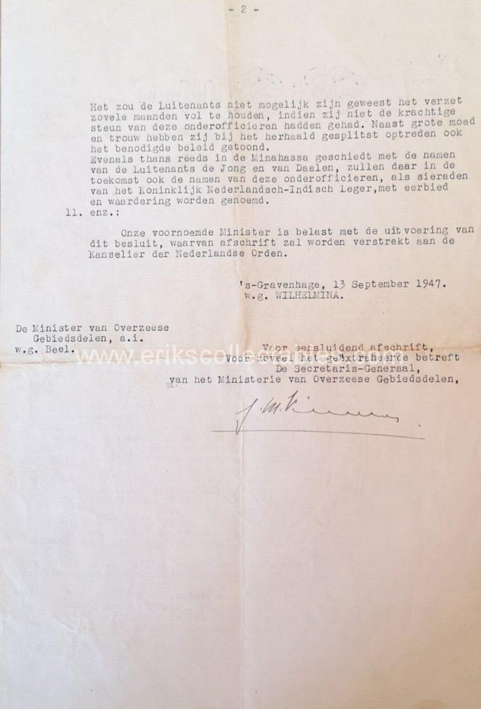 Lt Van Daalen was awarded the Bronze Lion before the awards to the NCO group. His text is different from that of the NCO’s but also different to that of the MWO. His award was made on January 27th 1947.