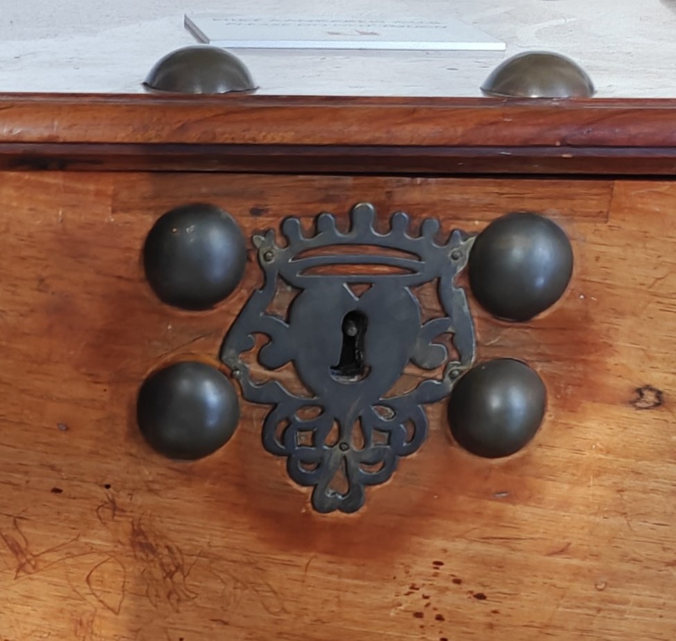 The second interesting part of the chest is the lid side of the lock plate. The top is in the form of a crown. Although crowns are often only seen as the headdress of kings and their likes in heraldry they are a sign of the rank of nobility. In this case not a Kings crown but that of a Dutch Earl (graaf) with a stylized Fleur de Lys in the middle and two halves on the outsides with pearls in between.