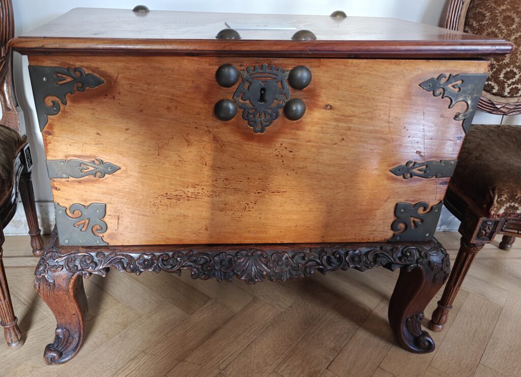 Below an example of a similar but somewhat smaller and simpler chest in Slot Zuylen, the castle that belonged to the noble family Van Tuyll van Serooskerken (Baron). The chest also features the “fleur de lys” and a crown on top of the lockplate!